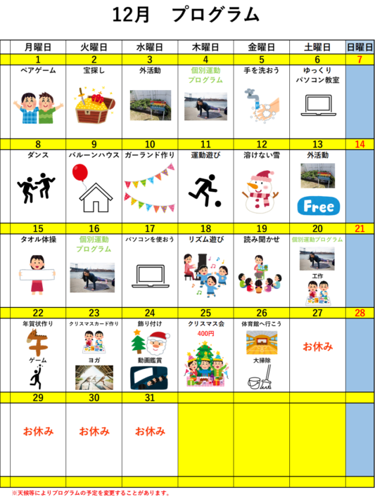 令和7年12月 月間プログラム(愛キッズ川内)